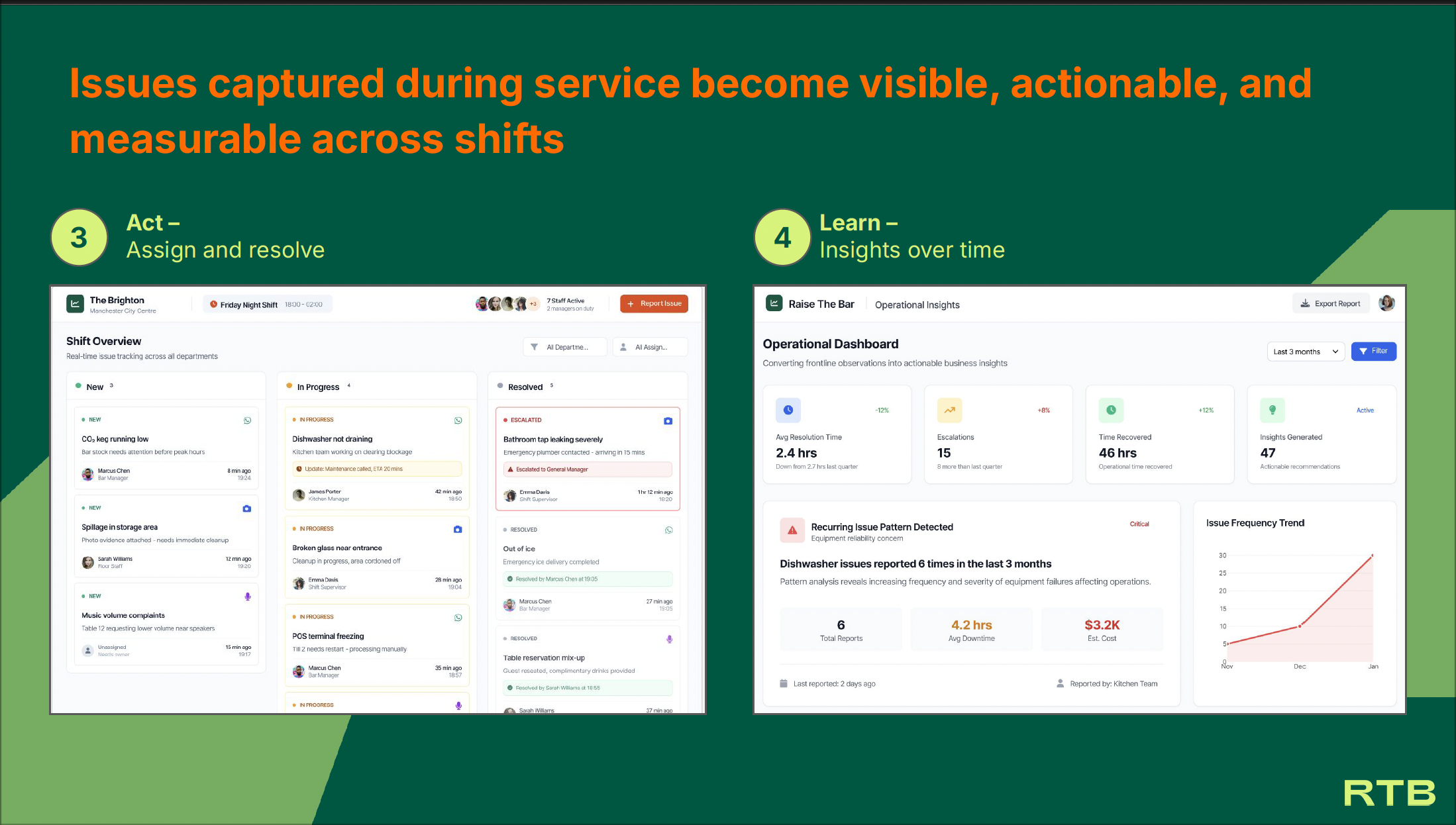 RTB converts these inputs into structured issues that managers can triage, assign, and resolve across teams and shifts.